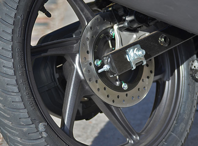 Se inclina con facilidad y la postura de manejo nos deja con el rostro casi encima del manubrio, lo que nos permite usar cómodamente el peso del cuerpo y maniobrar con perfecta visión de la rueda delantera. Está equipada con frenos a disco delanteros y traseros, de 240mm y 220mm respectivamente, que le dan un tacto y capacidad de frenada sobrenaturales para una moto de este segmento.