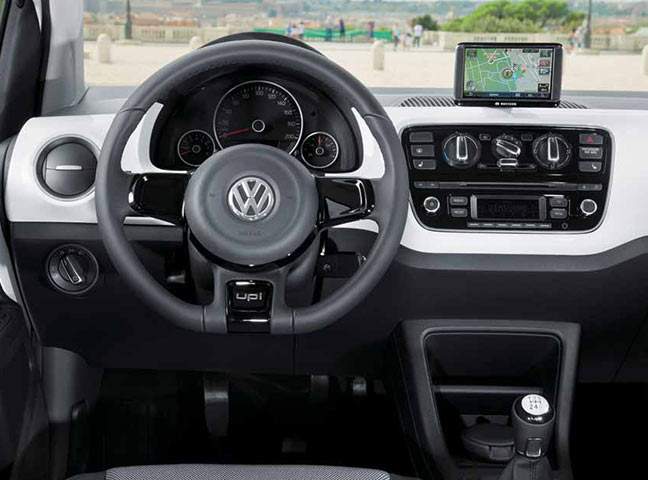Uno de los detalles son los faros, claramente más pequeños que los de otros modelos Volkswagen y el emblema VW cromado. En el interior se destacan sus asientos integrales: para el nivel “Take up!, se ofrece tela diseño “Orion”; para move up!, tela diseño “Phoenix”; para high up!, tela diseño “Andromeda” y para Black & White up!, tela diseño “Draco”. El baúl otorga 285 litros de volumen de carga.