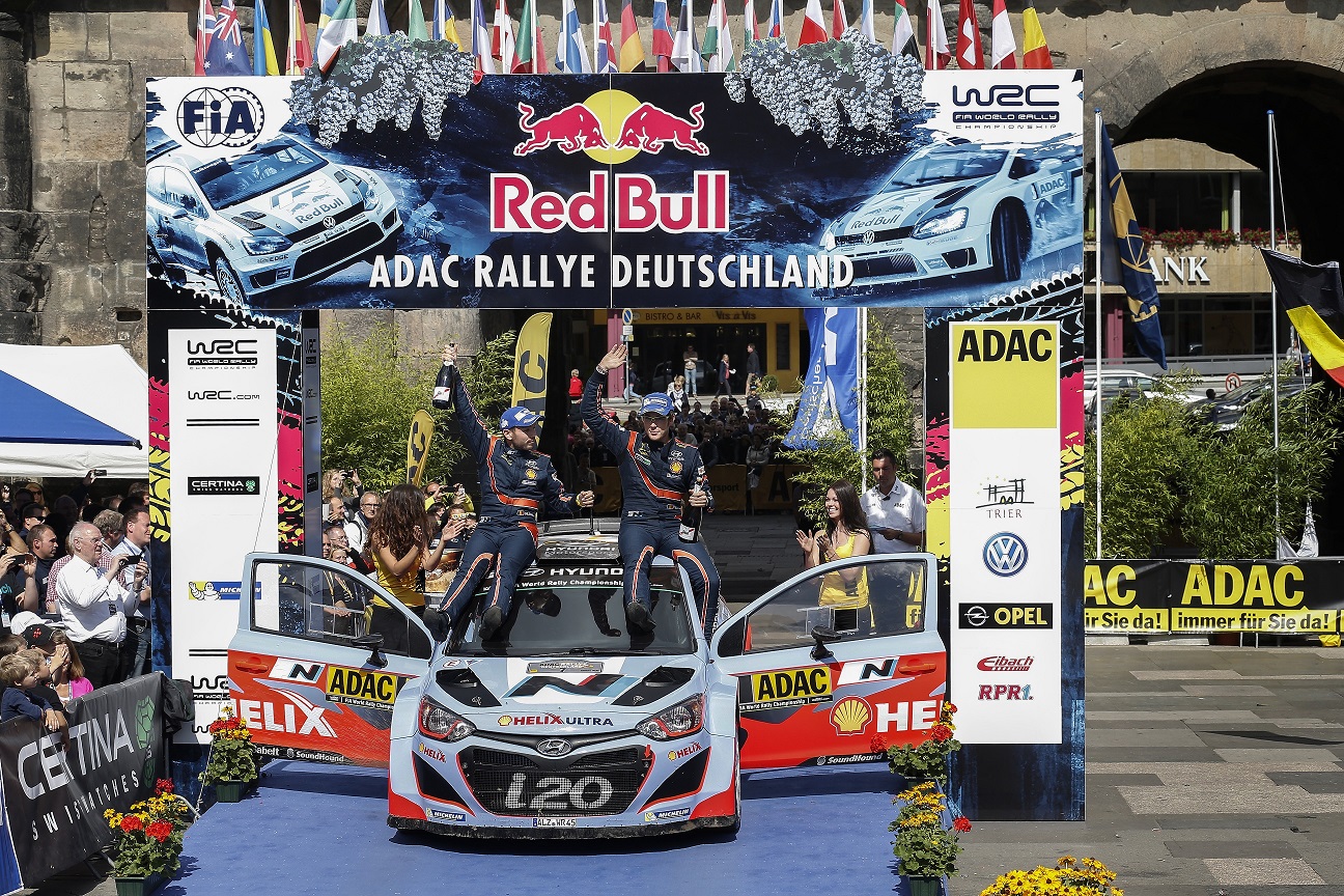 El Hyundai Shell World Rally Team consiguió su primera victoria en el Campeonato del Mundo FIA de Rally (WRC) al obtener un histórico 1-2 con Thierry Neuville y su compañero de equipo Dani Sordo durante la novena prueba del calendario 2014.