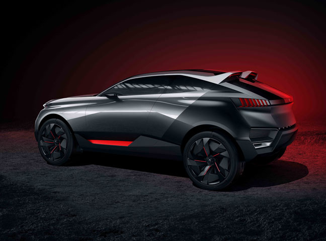 PEUGEOT QUARTZ. Se trata de un todoterreno con silueta de coupé y perfil deportivo, dotado de una mecánica híbrida que genera 500 caballos de fuerza. Posee un motor naftero THP de 1.6 litros de 270 CV, y agrega dos motores eléctricos de 115 CV cada uno, situados uno en cada eje. Es capaz de recorrer hasta 50 kilómetros propulsado únicamente por los motores eléctricos. Entre lo más destacado dispone de suspensiones neumáticas de altura variable (entre 30 y 35 centímetros), con un sistema de cámaras frontales que van “leyendo” el terreno y son capaces de preparar la regulación de la suspensión en forma anticipada y llantas son de 23 pulgadas.
