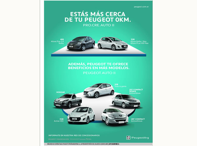 Peugeot venderá más de 5.500 autos a través de Pro.Cre.Auto y con este volumen alcanzaría el 22% del total de acuerdos de crédito concedidos por el Banco de la Nación Argentina para el plan. Este porcentaje ubicaría a Peugeot en el podio de ventas a través de este canal, comenrcializando el 408 Allure Plus 2.0 Nafta; 308 Allure 1.6, 308 Allure 1.6 Nafta Nav y 308 Allure Plus HDi Nav.