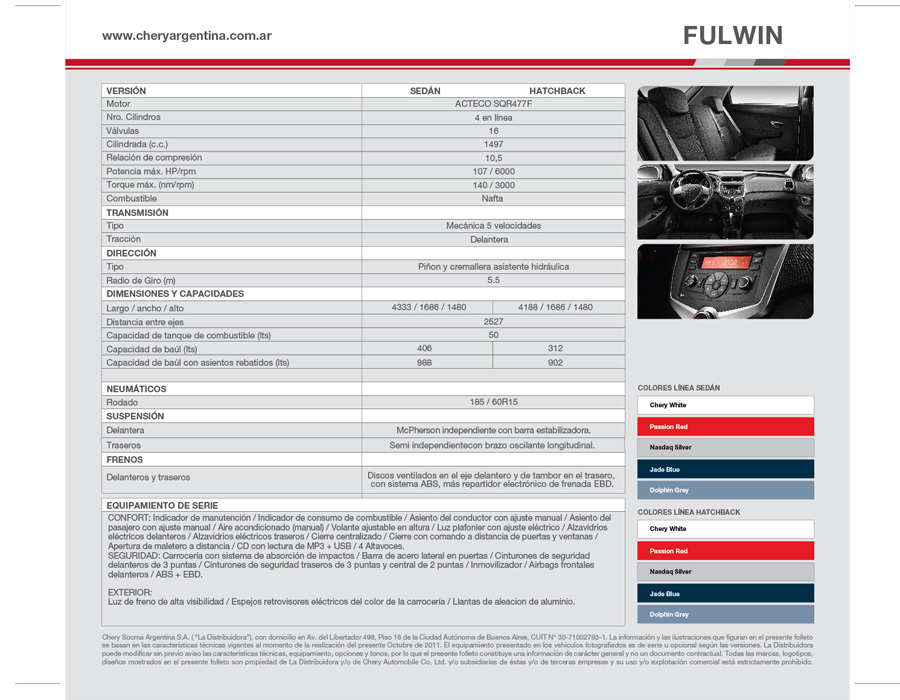 FULWIN. Se presenta en versiones hatch y sedán, ambos equipados con un motor 1.5L ACTECO de 16 válvulas y 107 caballos de fuerza. Está acompañado por una caja manual de 5 marchas.