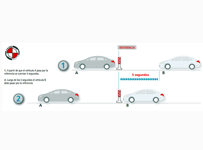EJEMPLO. Los 5 segundos de distancia entre auto y auto que venimos marcando desde hace muchos años en CESVI representan 140 metros entre ambos vehículos (100 km/h es igual 27 metros por segundo, que multiplicado por 5 segundos es igual a 140 metros) y esto hace posible detener al vehículo a la velocidad máxima de circulación antes de colisionar con el que lo precede.