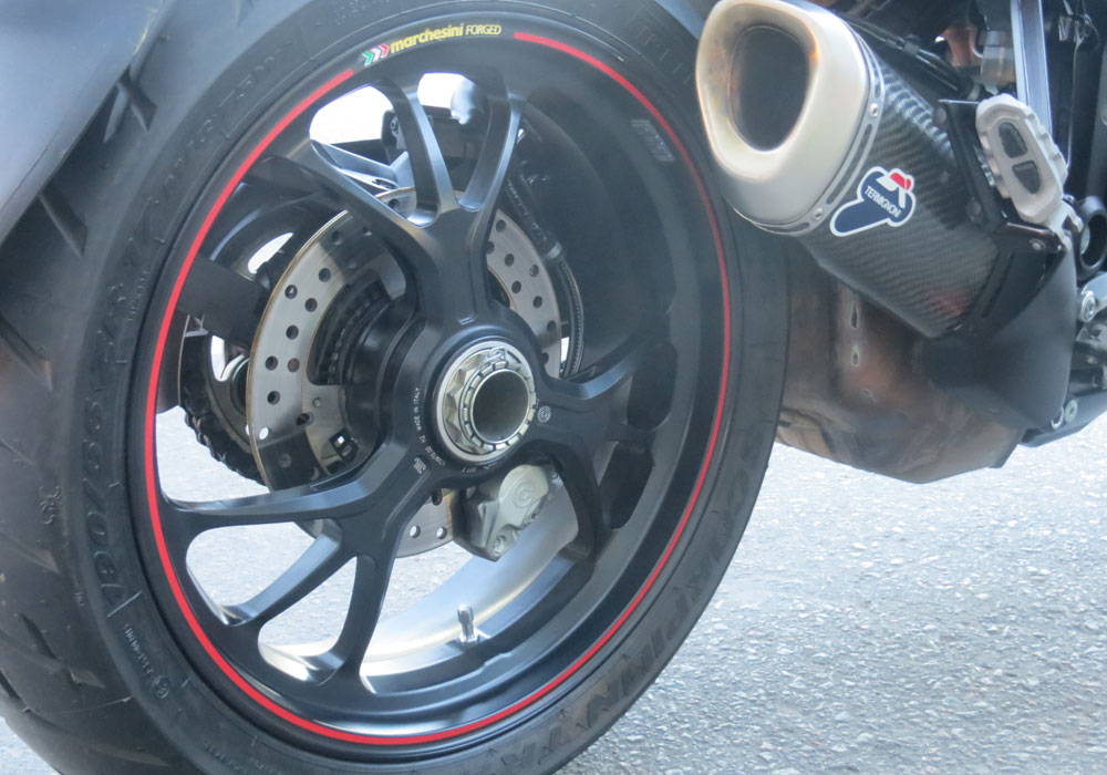 Modos de Conducción, modos de potencia, DSS, Ducati Safety Pack (ABS + DTC), RbW, Hands-Free. Llantas forjadas Marchesini, componentes en fibra de carbono: cúpula racing, guardabarros delantero, guardabarros trasero, tapas de distribución, conductos laterales, toma de aire frontal.