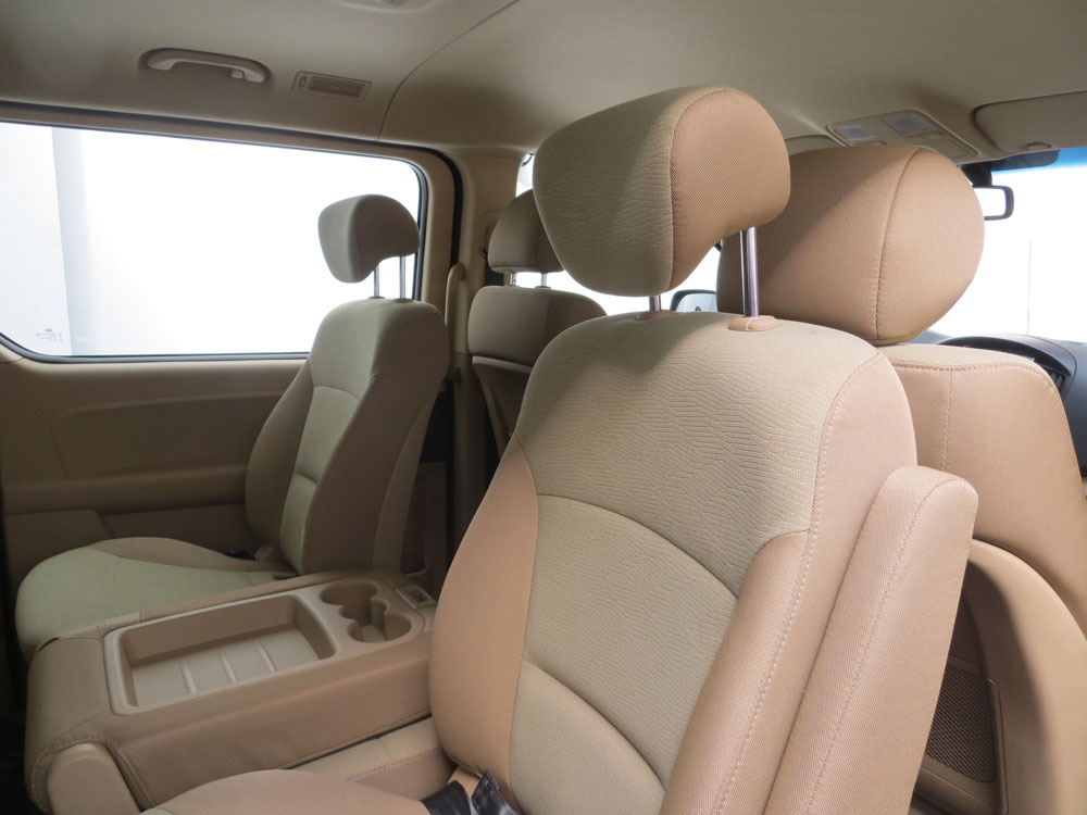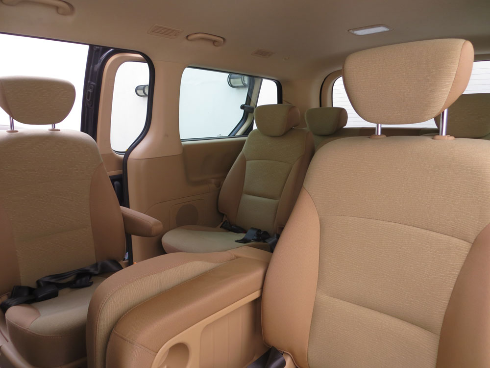 En el interior, la calidad de los materiales y terminaciones es muy destacada. Sobresalen los tapizados bitono en colores claros que combinan con las planchas del panel delantero y puertas, y conjugan a la perfección con los apliques plateados en la parte central del tablero y manijas. Las dos puertas laterales deslizables le otorgan una gran practicidad de acceso por ambos lados del vehículo, y en su segunda y tercer fila los asientos centrales pueden rebatirse y utilizarse como “mesas” (además tienen apoyavasos y espacio guarda objetos), generando un pasillo central para acceder a las plazas traseras. También las butacas de la segunda fila son giratorias con apoya brazos y deslizantes en la tercera fila. Esto genera múltiples opciones a la hora de configurar las plazas y el diseño se arma a «su gusto».