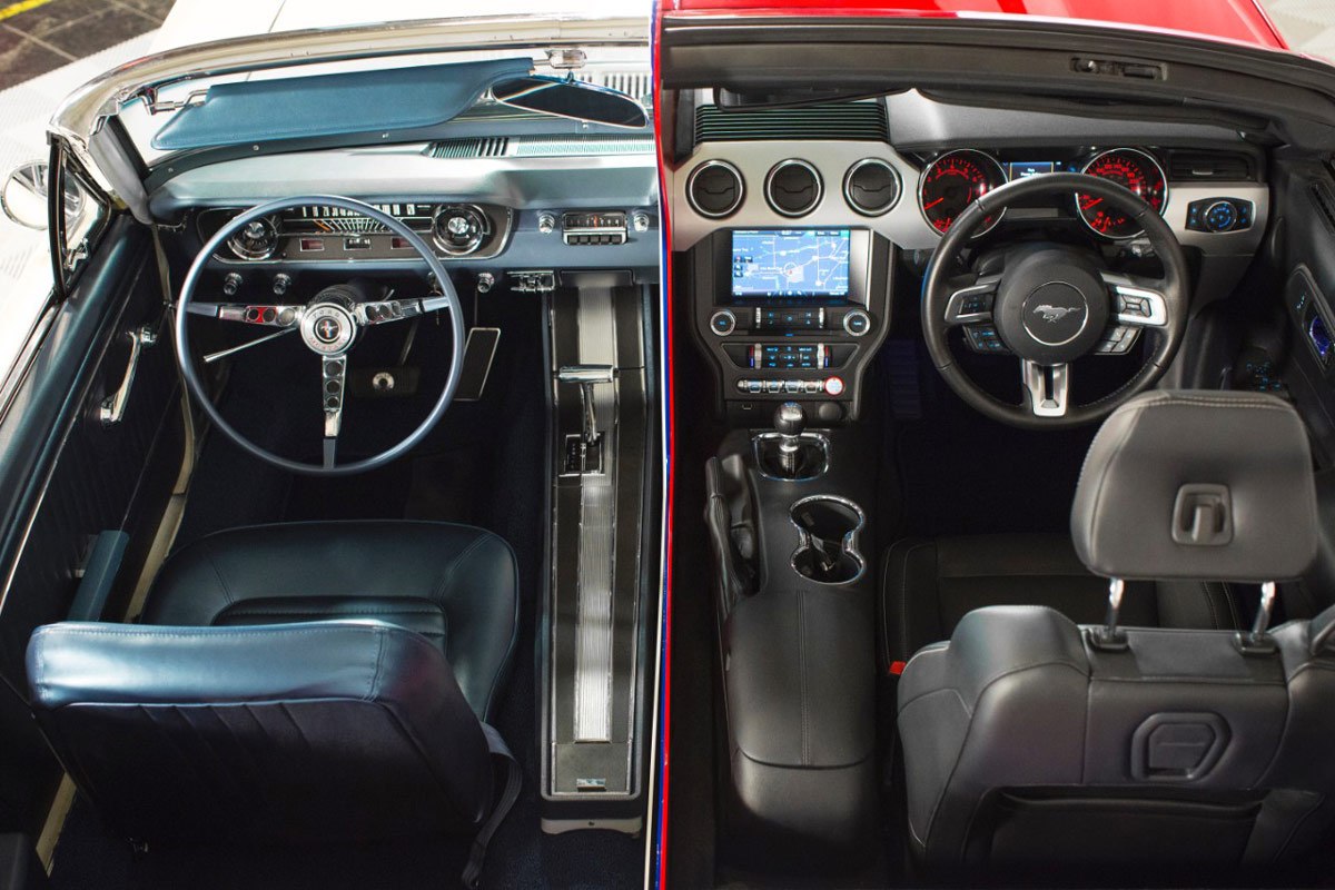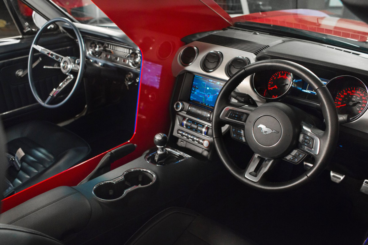 De este modo los visitantes podrán sentarse a ambos lados del auto y comparar sus características y detalles de diseño, desde la radio AM disponible en 1965 como así también la pantalla táctil del Mustang 2015. También hay una serie de parlantes por los que se permiten escuchar y comparar el sonido del motor V8 original con el actual.