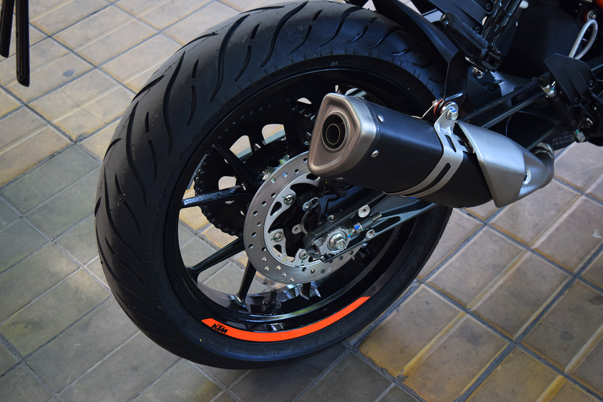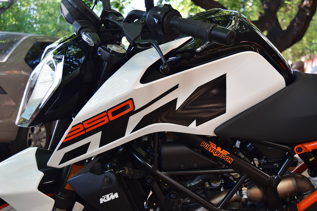 En el frente se puede apreciar la nueva estética adoptada por KTM para la renovación de sus Naked. El nuevo diseño de la 250 Duke se nota a simple vista, por ejemplo, en el tanque de combustible, el cual cambió su composición y capacidad (ahora es de 13,4 litros)