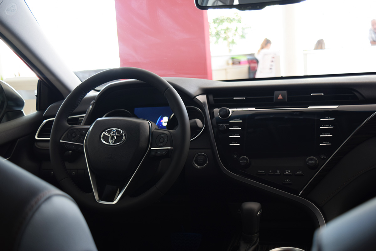 El nuevo Camry ofrece un renovado interior con asientos tapizados en color negro y detalles símil madera, en un panel completamente renovado, que adquiere los últimos lineamientos de la marca japonesa. Se destacan líneas dinámicas, con la última tecnología disponible.