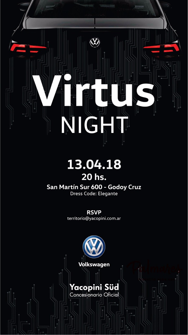 Entre las ciudades que integran este roadshow, por supuesto está Mendoza, que para esta Virtus Night tiene como concesionario oficial y destacado a Yacopini Süd (San Martín Sur al 600, Godoy Cruz), que prepara una fiesta a la altura de este modelo que junto con el nuevo Polo serán el centro de atracción de la velada.