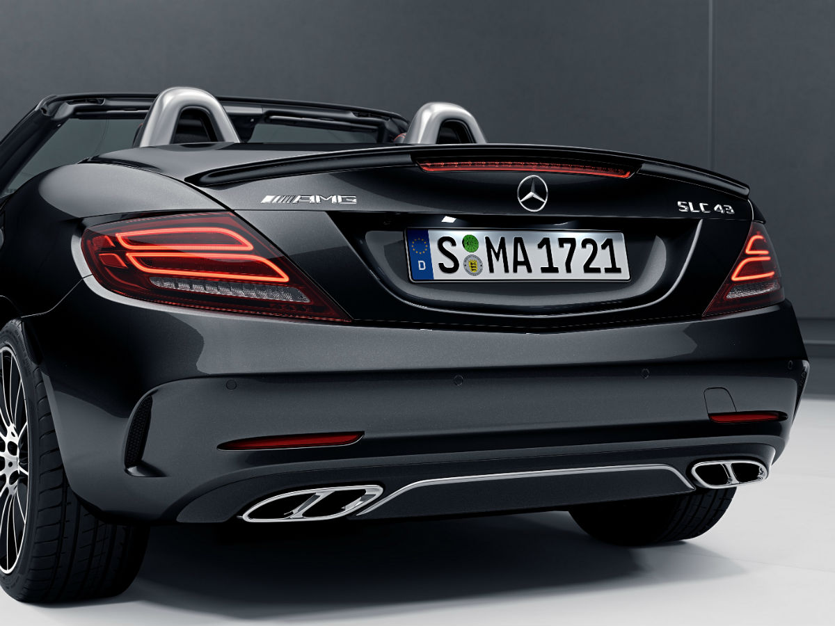 A sus líneas principales, esta variante AMG agrega un paragolpes trasero con difusor negro y embellecedores de la salida de escape integrados, que señalizan las propiedades dinámicas del SLC. La parrilla del radiador posee efecto diamante en cromo.