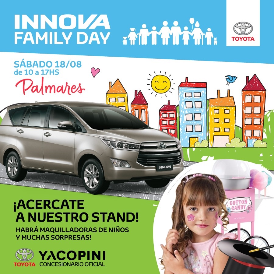 Este sábado 18, en Palmares Open Mall, Toyota Yacopini, concesionario oficial de la marca nipona en Mendoza, celebra el Innova Family Day. Este evento invita a toda a la familia, desde los más grandes a los más chicos, ya que todos podrán pasar un día muy divertido.