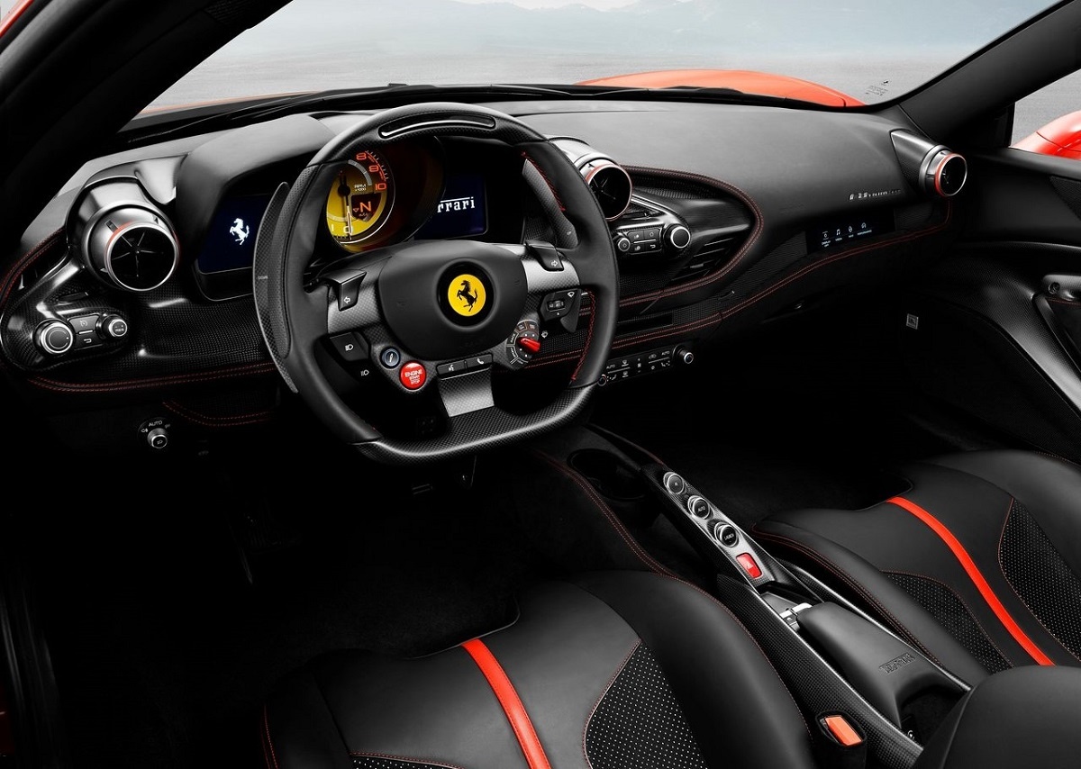 La cabina conserva el aspecto clásico, orientado al conductor, típico de las berlinettas con motor central de Ferrari, pero todos los elementos del tablero, los paneles de las puertas y el túnel han sido completamente rediseñados.