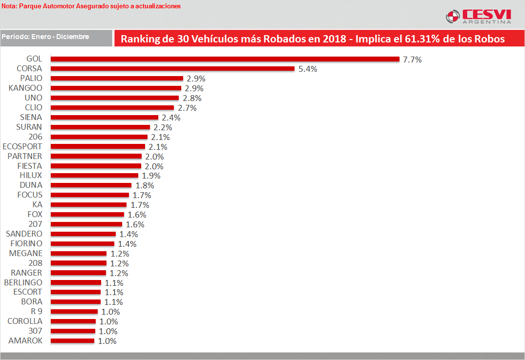 El Volkswagen Gol continúa siendo el modelo más robado con un 7.7%, seguido del Chevrolet Corsa (5.4%) y el Fiat Palio (2.9%).