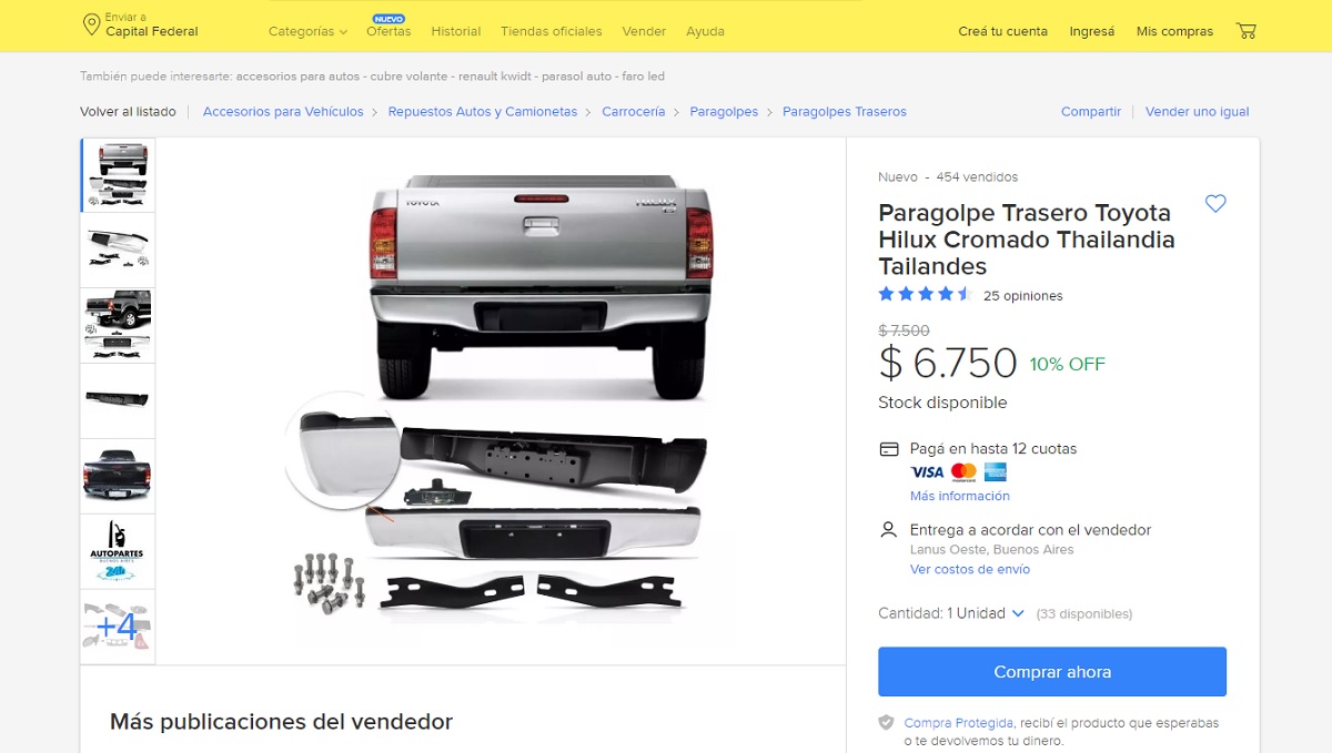 También se puede encontrar un kit de repuesto para paragolpe trasero cromado de Toyota Hilux. Este repuesto tiene 10% de descuento y tiene un valor de $6.750 y financiable hasta en 12 cuotas sin interés.
