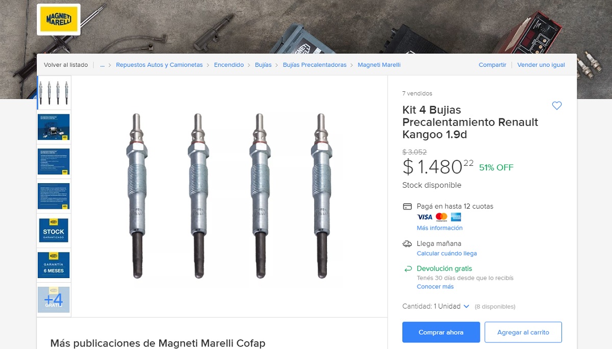 Por ejemplo, un kit de 4 bujías precalentamiento para Renault Kangoo 1.9d tiene un valor regular de $3.052, ahora está disponible con un 51% de descuento y quedan en $1.480,22 y es posible financiar hasta en 12 cuotas sin interés.