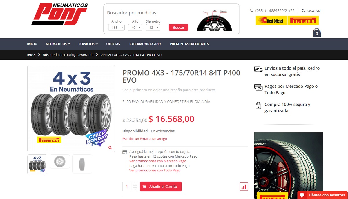 Luego, podemos encontrar cuatro neumáticos Pirelli por el precio de tres en la tienda Neumáticos Pons. El precio regular por este combo es de $23.254 y con Cyber Monday resulta en $16.567, con posibilidad de financiar hasta en 12 cuotas sin interés.