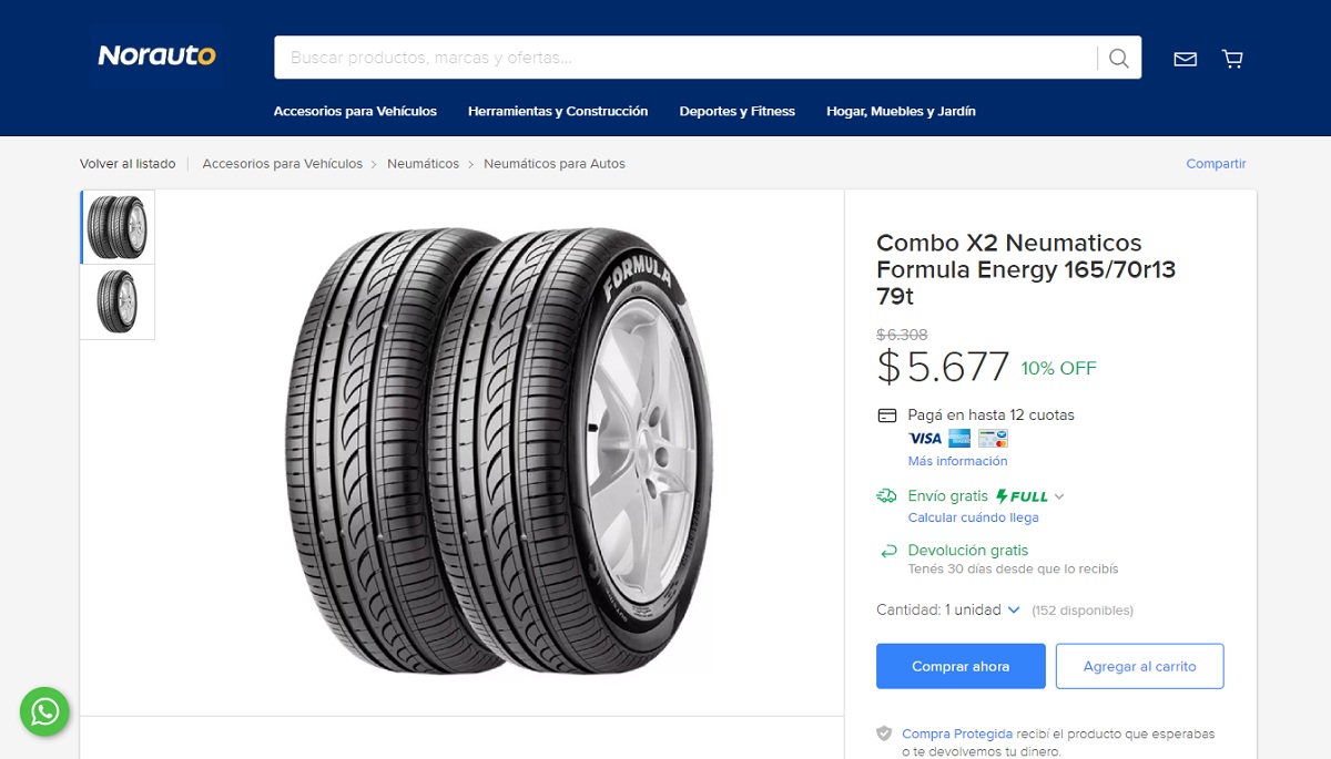 Por ejemplo, la tienda Norauto ofrece en Combo X2 neumáticos Formula Energy 165/70r13 79t, ideal para auto compactos. Estos tienen un precio regular de $6.308, pero con Cyber Monday se pueden conseguir a $5.677 y con la posibilidad de pagar hasta en 18 cuotas sin interés, además el envío a cualquier parte del país es Gratis.