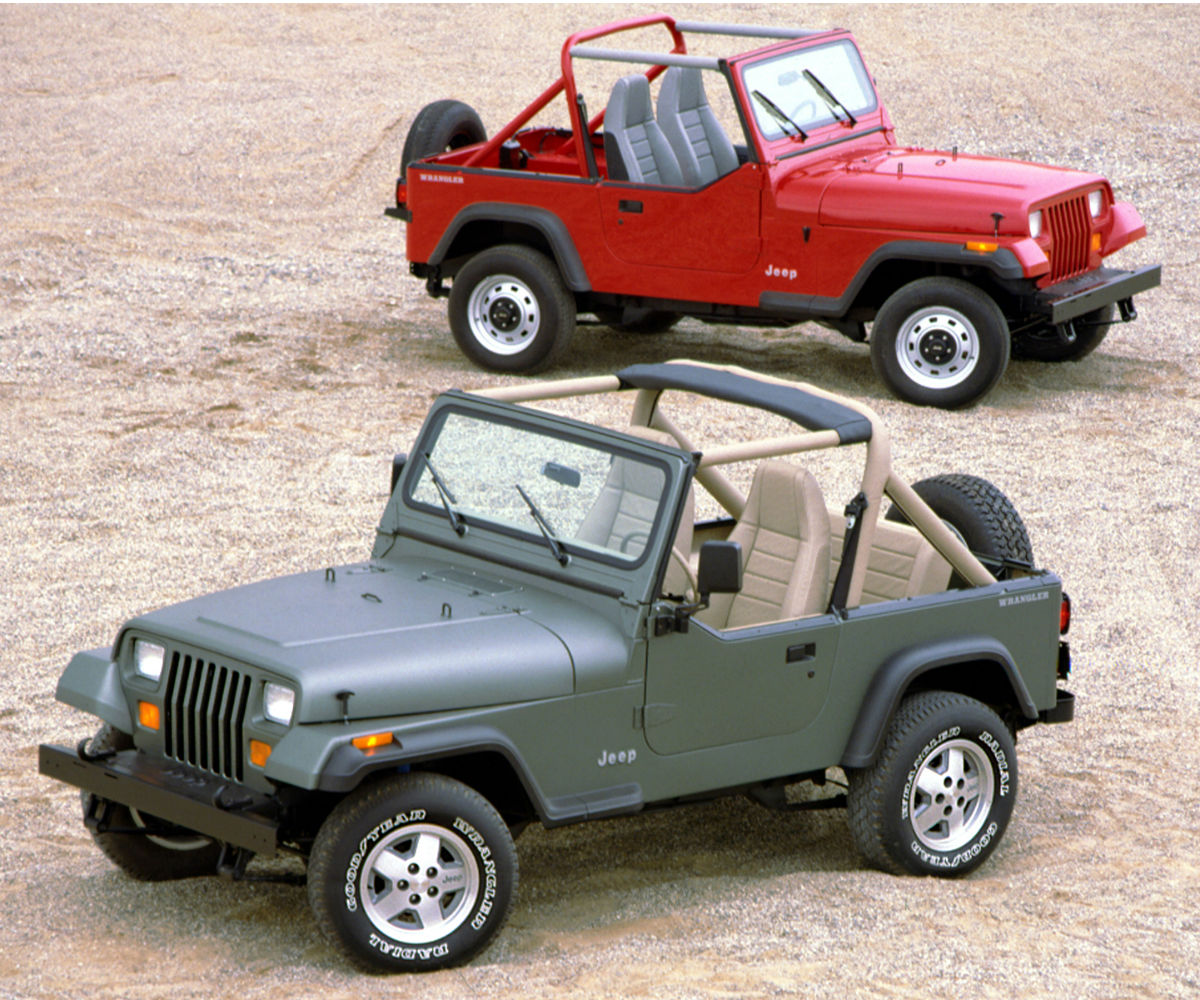 En 1986 el grupo Chrysler absorbió a American Motors Corporation que aún producía el veterano CJ. Con el respaldo económico del gigante americano se creó un nuevo Jeep, que actualizó el diseño e incorporó unos muy poco aceptados faros delanteros rectanculares. Por primera vez tomó el nombre Wrangler, aunque internamente fue conocido YJ, estando en producción hasta 1995.