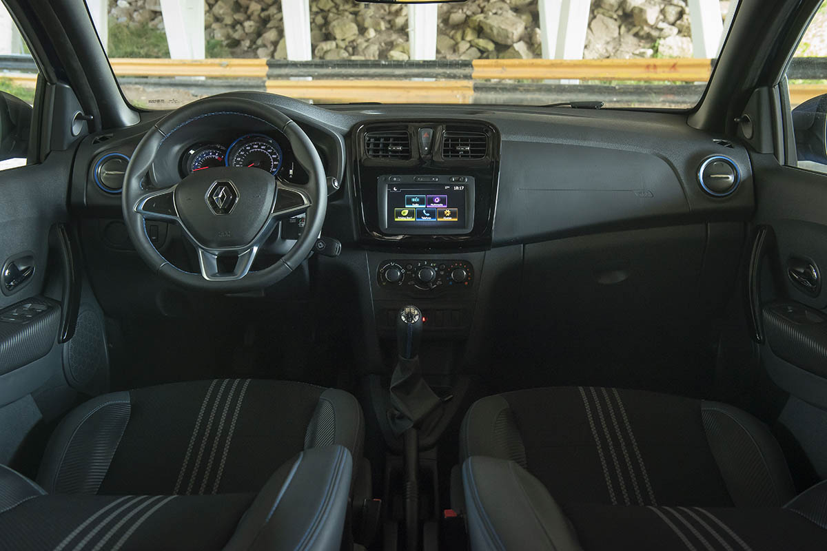 El nivel de equipamiento, cuenta con todas las mismas cualidades de confort que posee la versión Intens de la gama Sandero. Cuenta con limitador de velocidad y velocidad crucero, climatizador automático, sensores de estacionamiento y cámara de estacionamiento traseros, espejos eléctricos con luces de giro incorporadas, el sistema multimedia táctil Media Evolution, levantavidrios eléctricos impulsionales en las 4 puertas y llave navaja con apertura interna del baúl.