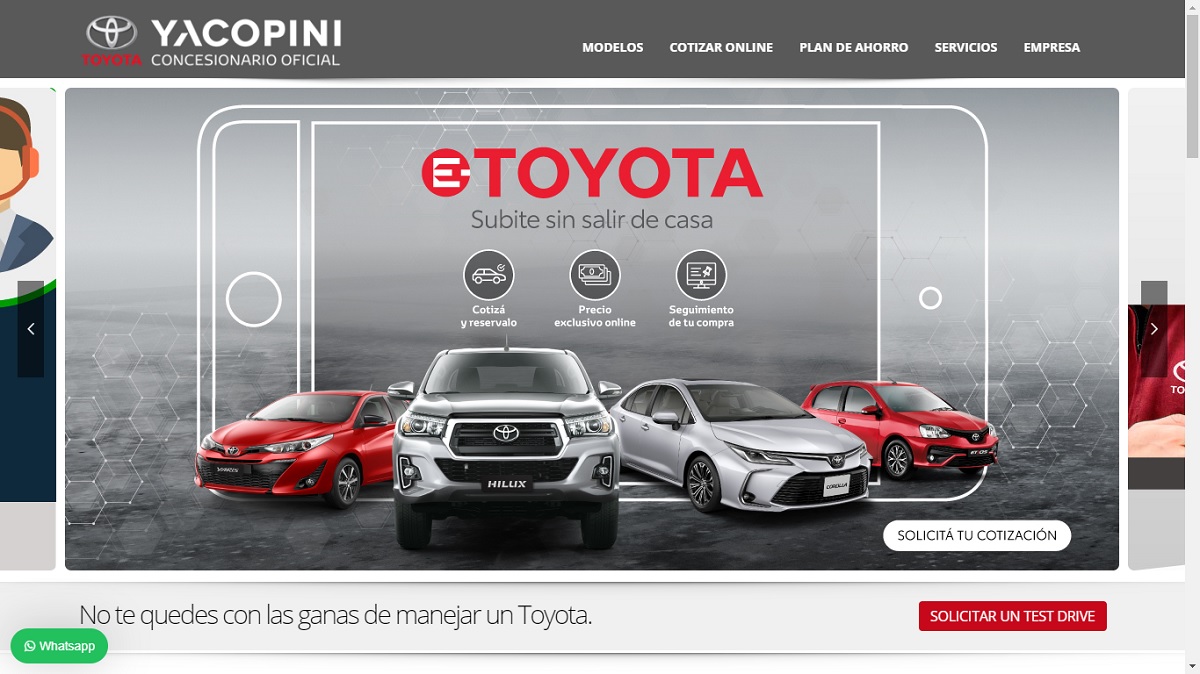 Toyota Yacopini utiliza un novedoso sistema en su web. Ingresando a www.yacopinisa.com, las personas podrán elegir el Toyota que buscan, configurarlo a su agrado, incluyendo la recepción de un usado como parte de pago y más importante, elegir la metodología de pago del 0KM, sin olvidar que este servicio ofrece precios y financiación especiales.
