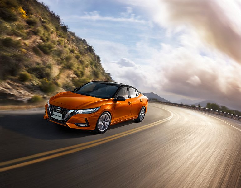 Desde el punto de vista del diseño el nuevo Sentra se presenta como un auto llamativo, más por la combinación de colores exteriores y techo «flotante», tal como la firma denomina al techo contrastado. Se destaca por un frontal deportivo, en el que la parrilla con formato de V se halla en una posición baja. Se combina con luces con tecnología LED, que le imprimen una mirada muy moderna.