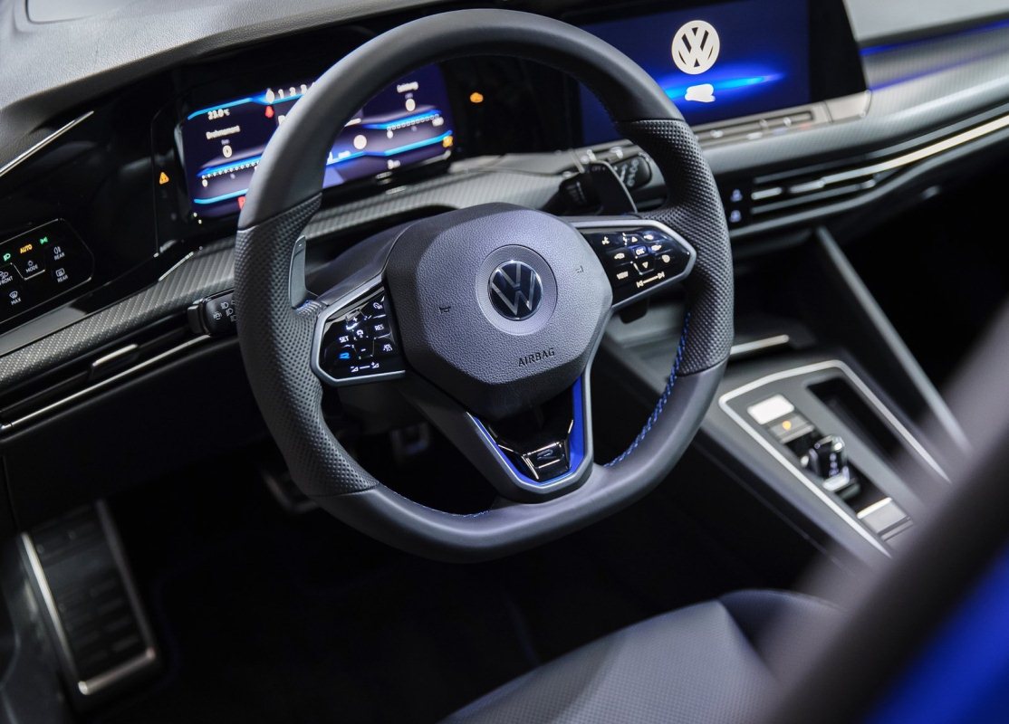 A su vez cuenta con un volante deportivo de cuero multifunción y calefactable, con costuras azules en contraste y botón «R» para la selección directa de los distintos perfiles de conducción. Entre otras cosas, de serie presenta decoración del tablero de instrumentos con apariencia de carbono, molduras de puertas específicas R, pedales y reposapiés de acero inoxidable cepillado, e iluminación ambiental de 30 colores para el tablero de instrumentos y las puertas.