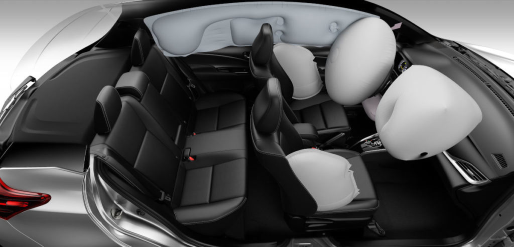 En cuanto a seguridad, el Yaris agrega equipamiento de seguridad pasiva, incorporando 5 airbags adicionales en sus versiones XS y XLS tanto Hatchback como Sedán: