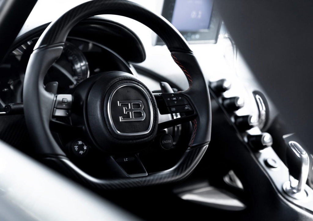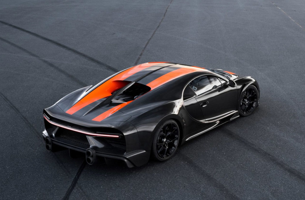 Yendo a la carrocería, nos encontramos que esta fue concebida en fibra de fibra de carbono negro azabache expuesta en el centro con rayas de carreras en Jet Orange. La cubierta negra del motor está hecha de carbono, al igual que el limpiaparabrisas. En la parte delantera se puede reconocer el modelo especial por el logo de Bugatti «Macaron» hecho de plata genuina y esmalte negro.