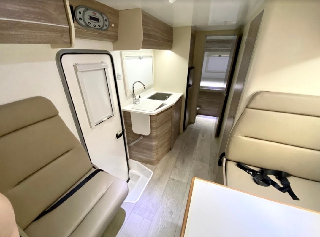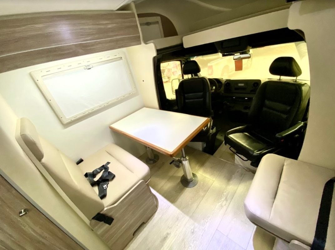 Los bancos cuentan con cinturones de seguridad, mientras que la mesa rebatible se convierte también en cama, con un aprovechamiento del lugar al máximo. En la parte superior de la cabina posee una cama extensible con comodidad para dos personas. Por su parte, ambas butacas de las cabina son giratorias, de forma que se integran a la mesa logrando mayor espacio y comodidad a la hora de utilizarla. También posee baño con todas las comodidades y ducha con cabina aislada.