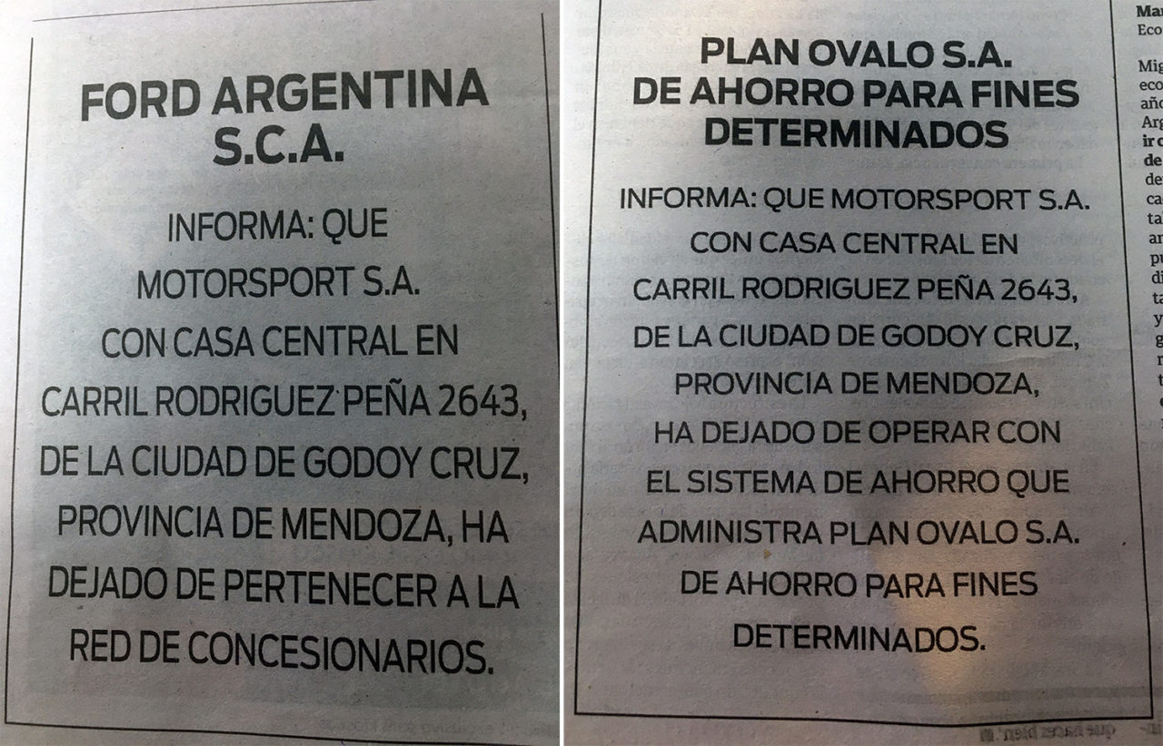 Finalmente la novedad se confirmó por avisos oficiales en diarios impresos de tirada nacional. Allí Ford Argentina anunció que el concesionario Meschini – Motorsport S.A. (de Godoy Cruz, Mendoza), dejaba de pertenecer a su red oficial de vendedores en nuestro país.