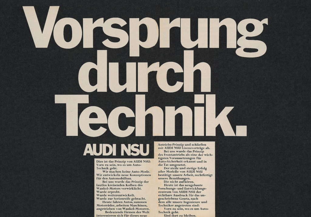 En 1969 se dió la fusión de Auto Union GmbH, con sede en Ingolstadt, y Neckarsulmer NSU Motorenwerke para formar Audi NSU Auto Union AG en Neckarsulm. La gama de modelos de la nueva compañía abarcaba desde los motores refrigerados por aire de la serie NSU Prinz de tracción trasera y los motores de cuatro cilindros refrigerados por agua de los Audi 60 y Audi 100 de tracción delantera hasta el motor rotativo de los modelos futuristas de esos tiempos como la NSU Ro 80. La idea de comunicar esta diversidad tecnológica como una ventaja competitiva surgió en 1970 de Hans Bauer. El empleado del departamento de publicidad de Audi NSU creó el eslogan que la gente de todo el mundo reconocería: «Vorsprung durch Technik».