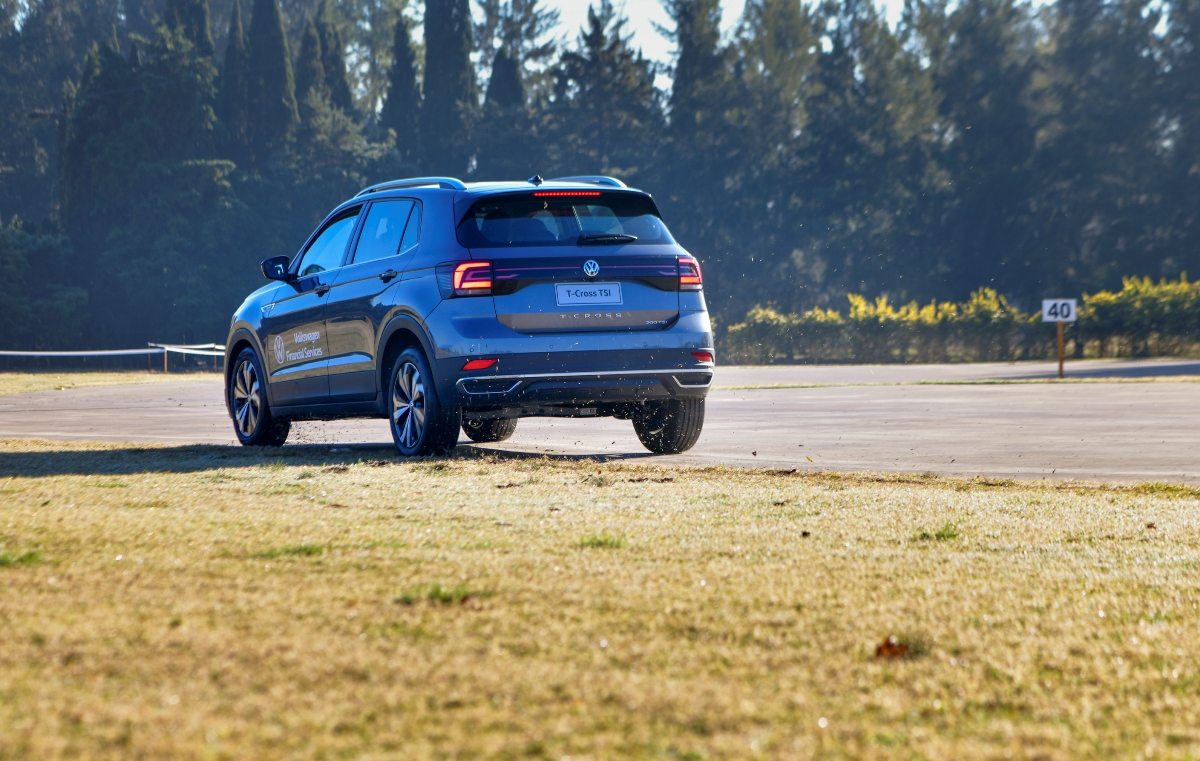 En lo que respecta al apartado dinámico el nuevo T-Cross TSI mejora al equipar frenos traseros de discos, con los que obtiene mejorada sensación de frenado. En un breve contacto en la pista de prueba pudimos comprobar su eficacia, incluso deteniendo la marcha con dos ruedas sobre el asfalto y dos sobre el pasto, algo que se encarga de gestionar la electrónica.