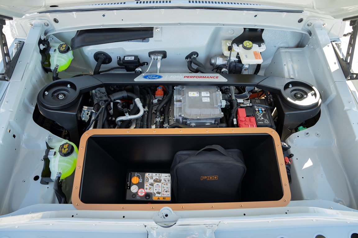 Esta imponente chata que Ford develó en la exposición fue realizada en colaboración con varios socios estratégicos, que se encargaron de realizar la adaptación de la tecnología 100% eléctrica. Los motores eléctricos son los mismos que emplea el Mustang Mach-E de producción.