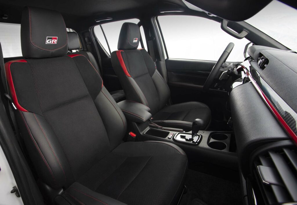 Los asientos delanteros deportivos de la nueva Hilux GR Sport están tapizados en una combinación de cuero natural y ecológico combinado con Suede sintético perforado y detalles en rojo. Los tapizados del techo y pilares en color negro crean un ambiente más deportivo en donde se destacan los distintivos de la marca Gazoo Racing, como la llave, la placa de identificación con el número de unidad, los apoyacabezas, la pedalera de aluminio y los cubre-alfombras exclusivos de este modelo.