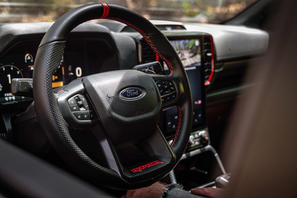 Puertas adentro también aparecen novedades, la pickup luce un volante deportivo con levas de magnesio incorporadas, iluminación LED interior de ambiente y exclusivos asientos deportivos de cuero con posibilidad de ser calefaccionados con ajuste eléctrico de hasta 10 posiciones para las plazas delanteras, diseñados por el equipo de Ford Performance grabados con el logotipo “Raptor” con costuras acentuadas en “código naranja”.
