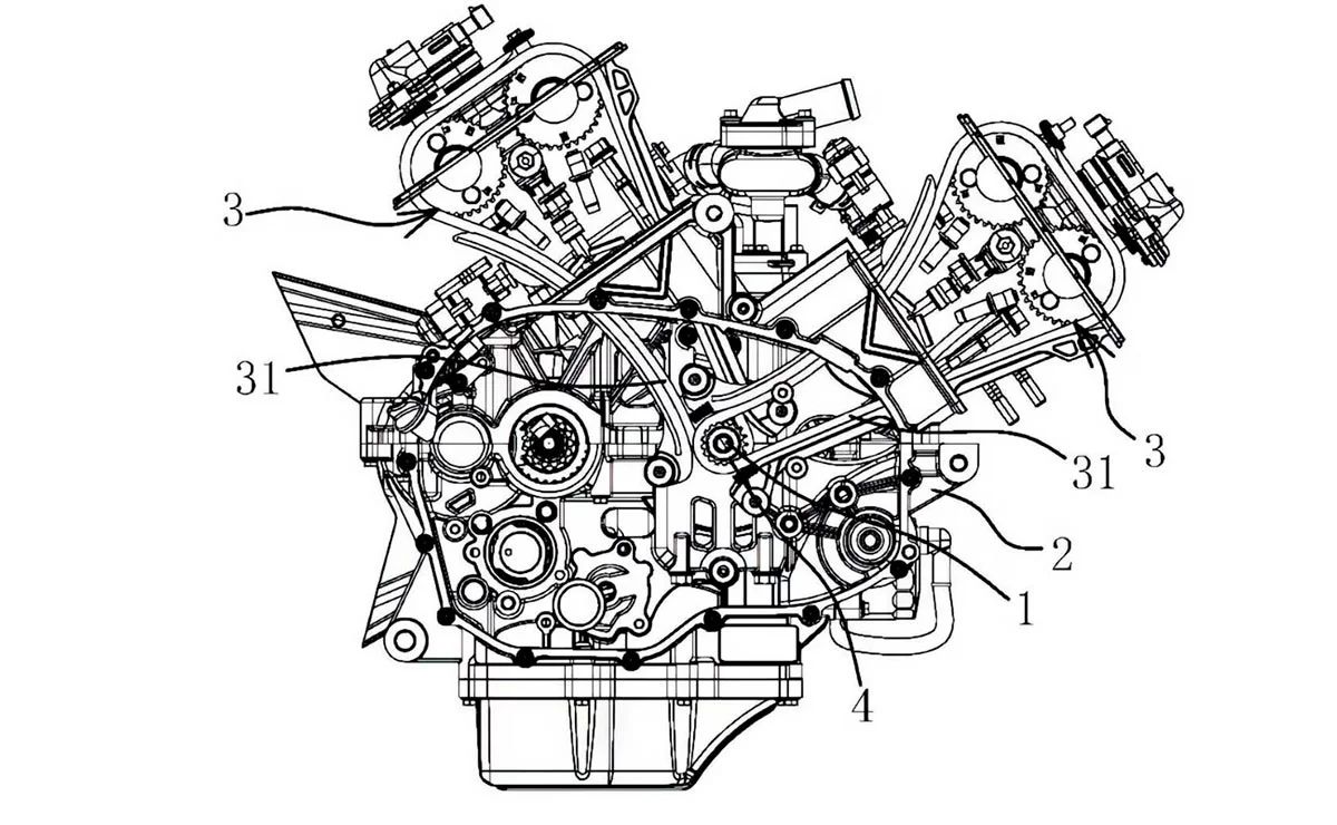 Este motor V4, ha aparecido ya en en reiteradas solicitudes de patentes publicadas en China durante las últimas semanas, dando a conocer que se trata de un motor V4 de 90 grados, con doble árbol de levas a la cabeza, accionado por cadena y cuatro válvulas por cilindro. Si bien, existen algunas similitudes generales entre el diseño del motor chino y el de la última generación de motor de la VFR800 de Honda, no parecería ser un clon, ya que cuenta con diferencias mínimas en algunos elementos como el retorno del aceite o la lubricación de la transmisión.