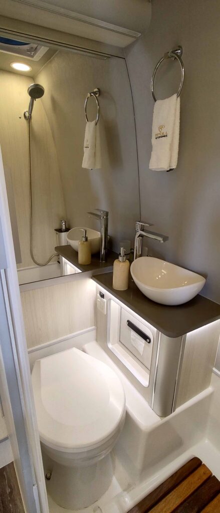 Las duchas están aseguradas con un flexible de maya metálica y grifería monocomando independiente. Espejo, jabonera, toallero, portarrollos y cerramiento corredizo acrílico no faltan. También tienen lugar un desagote del sector de ducha a cámara de aguas grises y extractor de 12v con ventilador al exterior.
