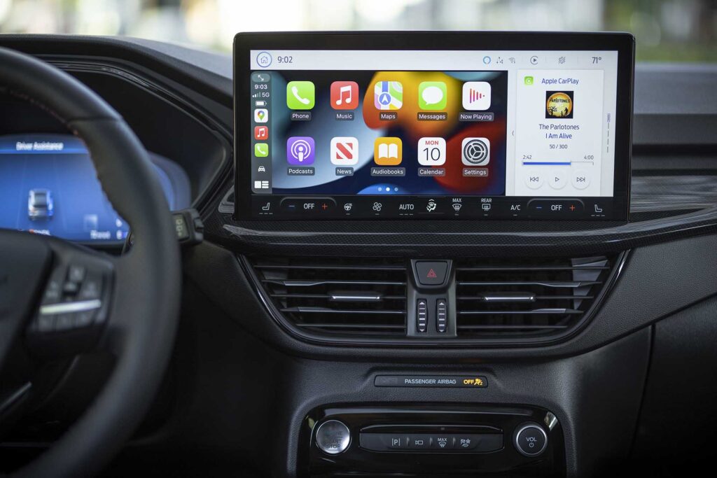 Puertas adentro combina un diseño sofisticado y minimalista, con tapizado de cuero, asientos calefaccionados y ajustables eléctricamente. Ofrece, además, una experiencia digital inmersiva a través de tres pantallas, incluyendo un nuevo sistema multimedia SYNC 4 con una nueva pantalla táctil de 13,2” compatible con Android Auto y Apple Car Play con conexión inalámbrica, un panel de instrumentos digital configurable de 12,3” y un head-up display que muestra información sobre la velocidad, navegación y asistencias a la conducción. El sistema de audio premium B&O cuenta con 10 parlantes y subwoofer, y cuenta con cargador de smartphone inalámbrico.