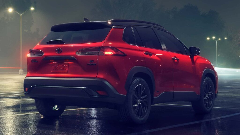 El Corolla Cross Nightshade toma de base la configuración SE híbrida y añade detalles en negro al exterior, faros nuevos, carrocería en tono Jet Black o Barcelona Red, techo también con posibilidad de color Jet Black o Celestite Grey. También aparecen llantas 18 pulgadas en negro brillante, entre otros detalles. Puertas adentro aparecen butacas especiales revestidas en tela negra y roja, con costuras rojas.