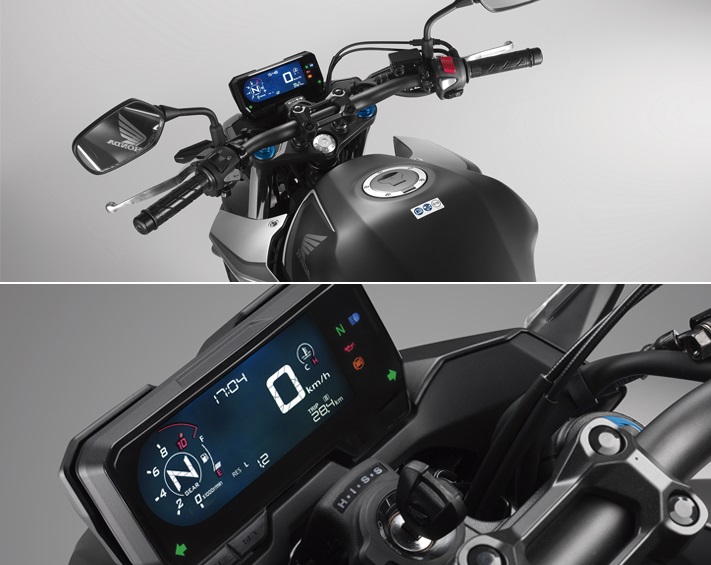Al frente la Honda CB500F equipa un faro full LED de doble lente, luego encontramos una pantalla LCD digital, donde se ofrece toda la información del vehículo. En el tanque aparece el revolucionario sistema de inyectores “PGM-FI”, es decir, mayor capacidad del tanque de combustible, de 16,7 Lts. a 17,1 Lts. (reserva 3,2 Lts.), menor peso en orden de marcha, de 191 Kg. a 189 Kg.