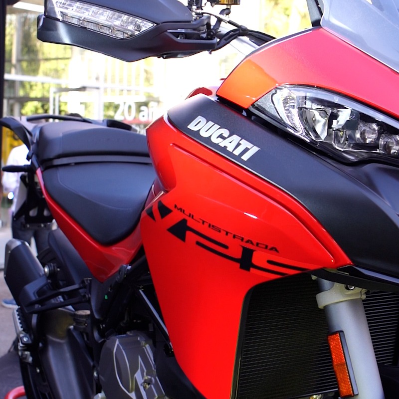 Esta Multistrada ofrece de serie cuatro modos de conducción, sensor giroscópico de seis ejes, suspensión ajustable, tanque de combustible de 20 litros, control de tracción ajustable en ocho niveles y frenos ABS, capaz de regarlo en tres niveles.