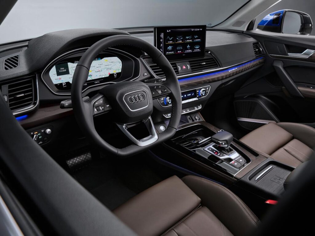 En el caso del 45 TFSI Advanced podemos resaltar el Audi drive select, el Audi virtual cockpit plus, Audi smartphone interface, techo corredizo panorámico, luces delanteras y traseras 100% LED, tapizados en combinación cuero / cuero sintético, sensores de estacionamiento delanteros y traseros con cámara de marcha atrás, asientos deportivos calefaccionados eléctricos con memoria para el conductor y llantas Audi Sport de 5 radios en V, gris grafito, torneado brillante, 235/55 R19, entre otros.