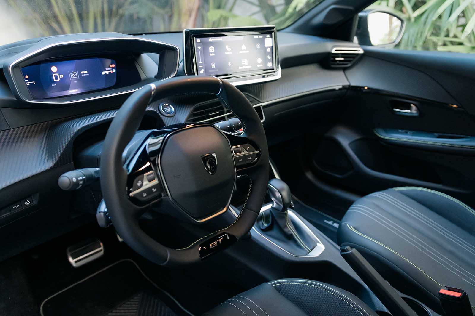 En el interior, el Peugeot 208 mantiene su diseño de puesto de conducción i-Cockpit, un sistema que incorpora un volante compacto, un panel de instrumentos elevado y una pantalla táctil para que el conductor acceda fácilmente a las funciones principales. Las teclas «toggles switches» permiten acceder de forma directa a opciones del vehículo, mientras que el display digital cuenta con diferentes modos de visualización, desde el tradicional hasta configuraciones personalizadas en la versión GT.