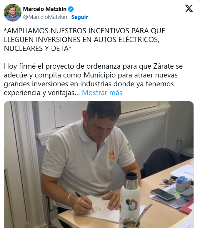 “En Zárate, toda empresa que quiera instalarse para producir vehículos eléctricos no pagará impuestos por dos décadas. Te esperamos, Elon Musk”, expresó Matzkin a través de la red social X, en un claro mensaje al empresario.