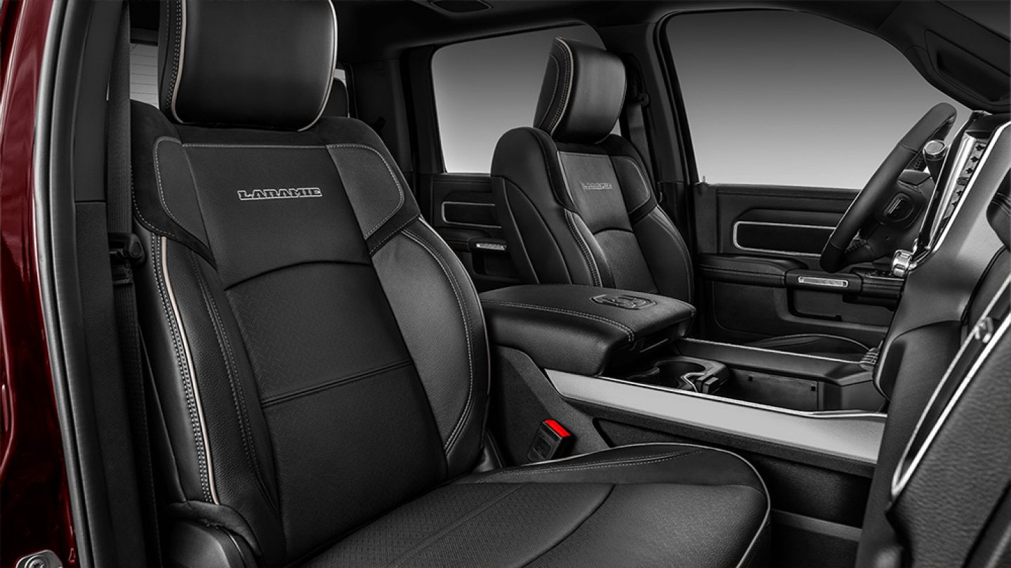 Puertas adentro, la RAM 2500 Laramie deja ver por qué se destaca como una de los más equipadas del segmento. Su consola central se distingue por su espacio y practicidad, con un compartimento para notebook de hasta 15 pulgadas, base para celulares o tablets, y múltiples opciones de almacenamiento, incluyendo 9 puertos USB, 2 tomas de 115V y cargador inalámbrico de celulares con sistema RamCharge. Los asientos están revestidos en cuero y las plazas delanteras cuentan con regulación eléctrica y calefacción. El volante multifuncional, recubierto en cuero, incorpora un sistema de calefacción para mayor confort en días fríos. En las plazas traseras, las salidas de aire y los portavasos adicionales aseguran que cada viaje sea cómodo para todos los pasajeros.