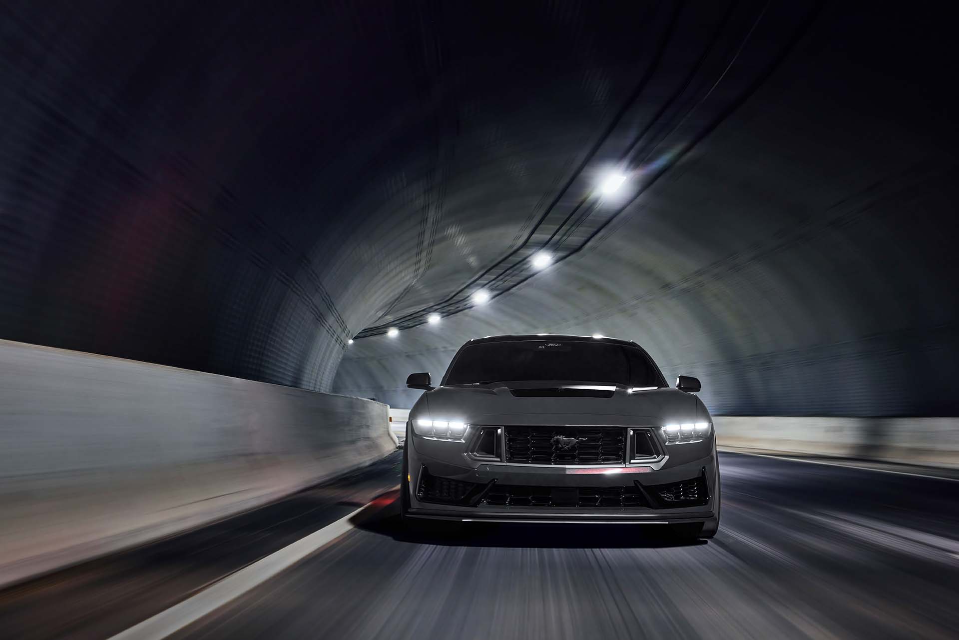 En su exterior, presenta una parrilla con estilo clásico y el icónico logo de Mustang con acabado negro mate. Sus ópticas Full LED con un acabado oscurecido le aportan una apariencia intimidante, mientras que en el capó se aprecian franjas negras con terminación mate y la leyenda “Dark Horse” en cada costado. La identidad visual se refuerza con el emblema Dark Horse, que por primera vez muestra al icónico caballo Mustang de frente. Los faros delanteros y traseros son Full LED, proporcionando una iluminación más eficiente mientras conservan el formato de tres barras, un sello distintivo del Mustang.