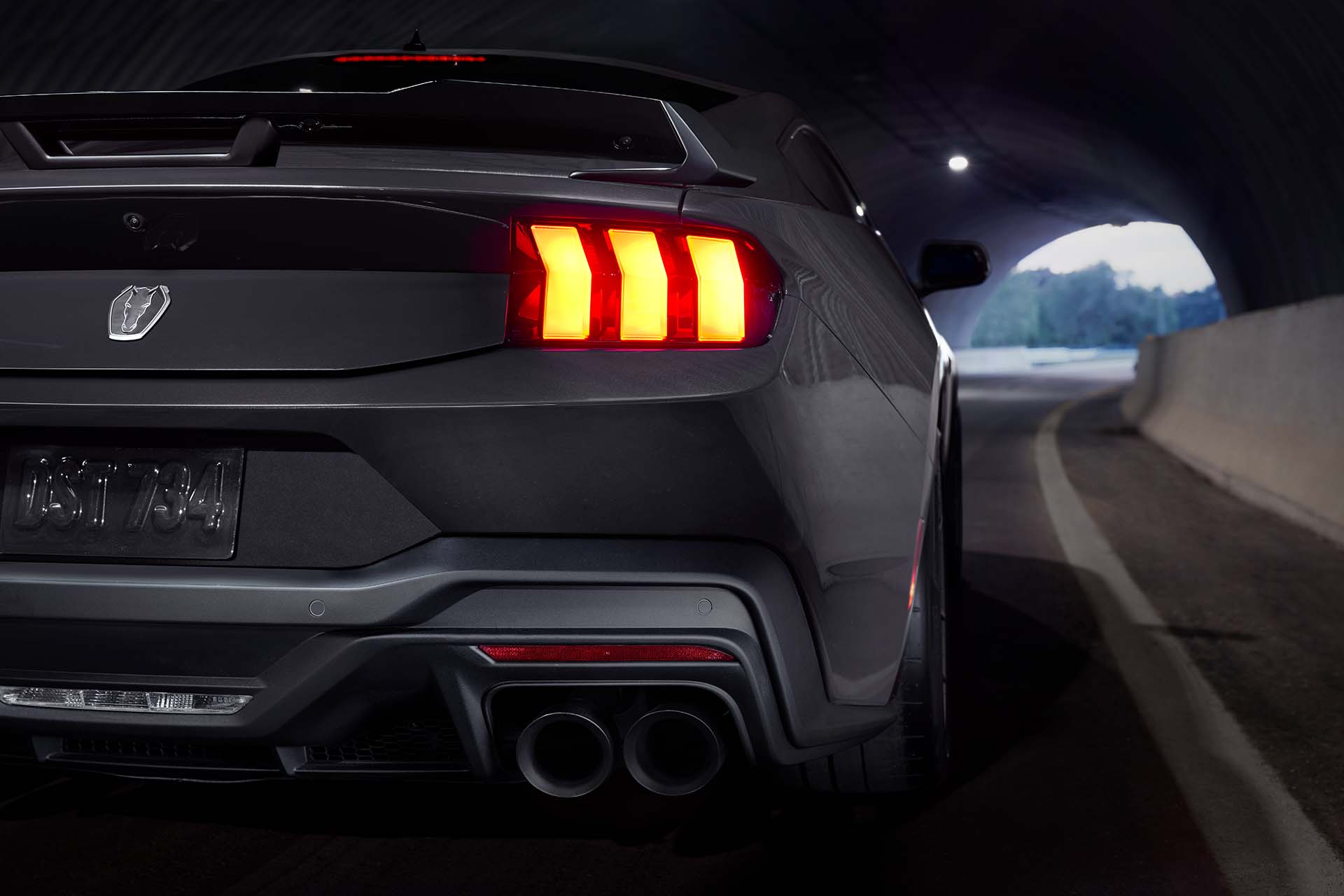 El equipamiento exterior se completa con elementos distintivos tales como el emblema Mustang delantero oscurecido y espejos retrovisores externos eléctricos y plegables que incorporan luces de conducción y proyección del emblema Mustang. La iluminación trasera se destaca con faros Full LED, luz de freno Brake-light y luces de firma con ADN Mustang. Para reforzar su identidad exclusiva, el Dark Horse incluye zócalos de puerta con inscripción Mustang Dark Horse.