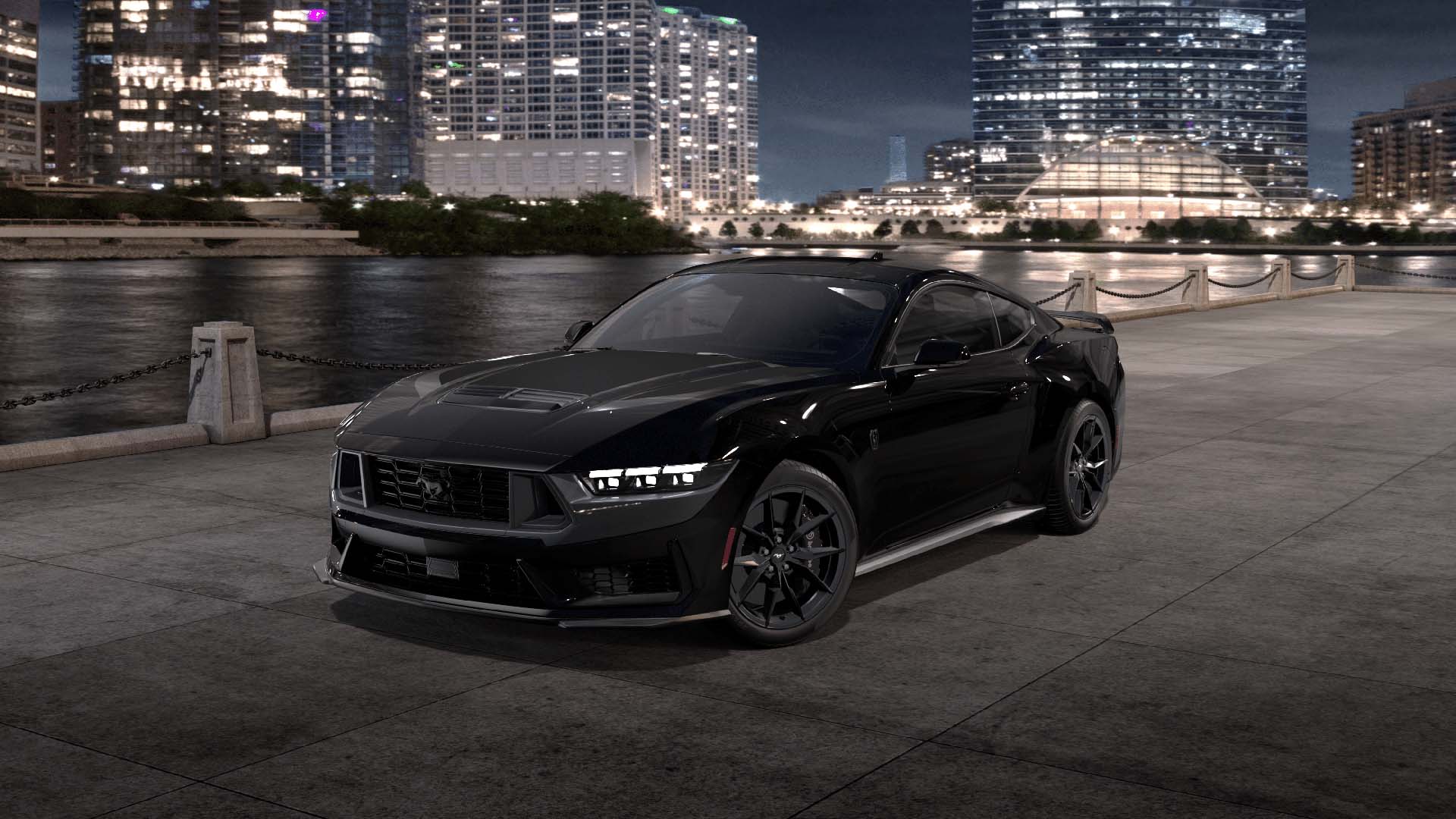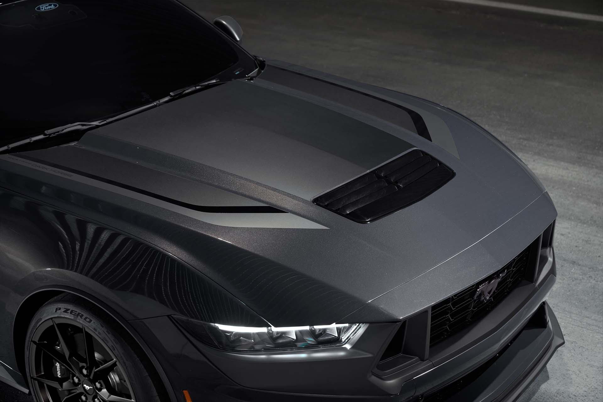 El aspecto agresivo de la carrocería indica que el Mustang Dark Horse es un ejemplar diferenciado, de presencia imponente. A las líneas rectas que caracterizan a esta séptima generación de Mustang, se incorpora una estética totalmente oscura y agresiva, tal como su nombre lo indica. La séptima generación de Mustang propone una reinterpretación actual de los elementos de diseño originales y atemporales del ícono, manteniendo el clásico ADN Mustang. Su silueta conserva las proporciones clásicas de capot largo, parte trasera corta y techo bajo, pero con una nueva interpretación estilística. Las líneas de la carrocería muestran pliegues más definidos y radios más cortos, con transiciones rápidas que destacan su aerodinámica mejorada en túnel de viento.
