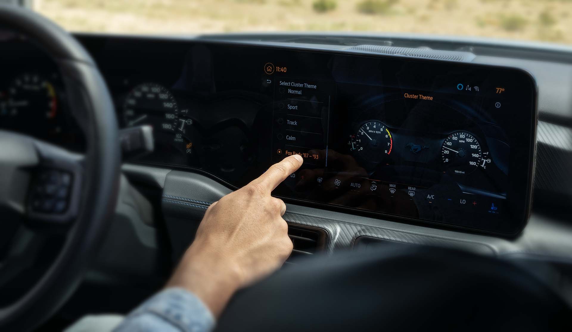 El tablero de instrumentos proporciona varias opciones de visualización; se mantiene el homenaje al tablero de instrumentos utilizado por los Mustang Fox Body de los 80 (presente en la versión actual de Mustang) y se suman otros guiños al pasado ofreciendo una experiencia aún más personalizada.