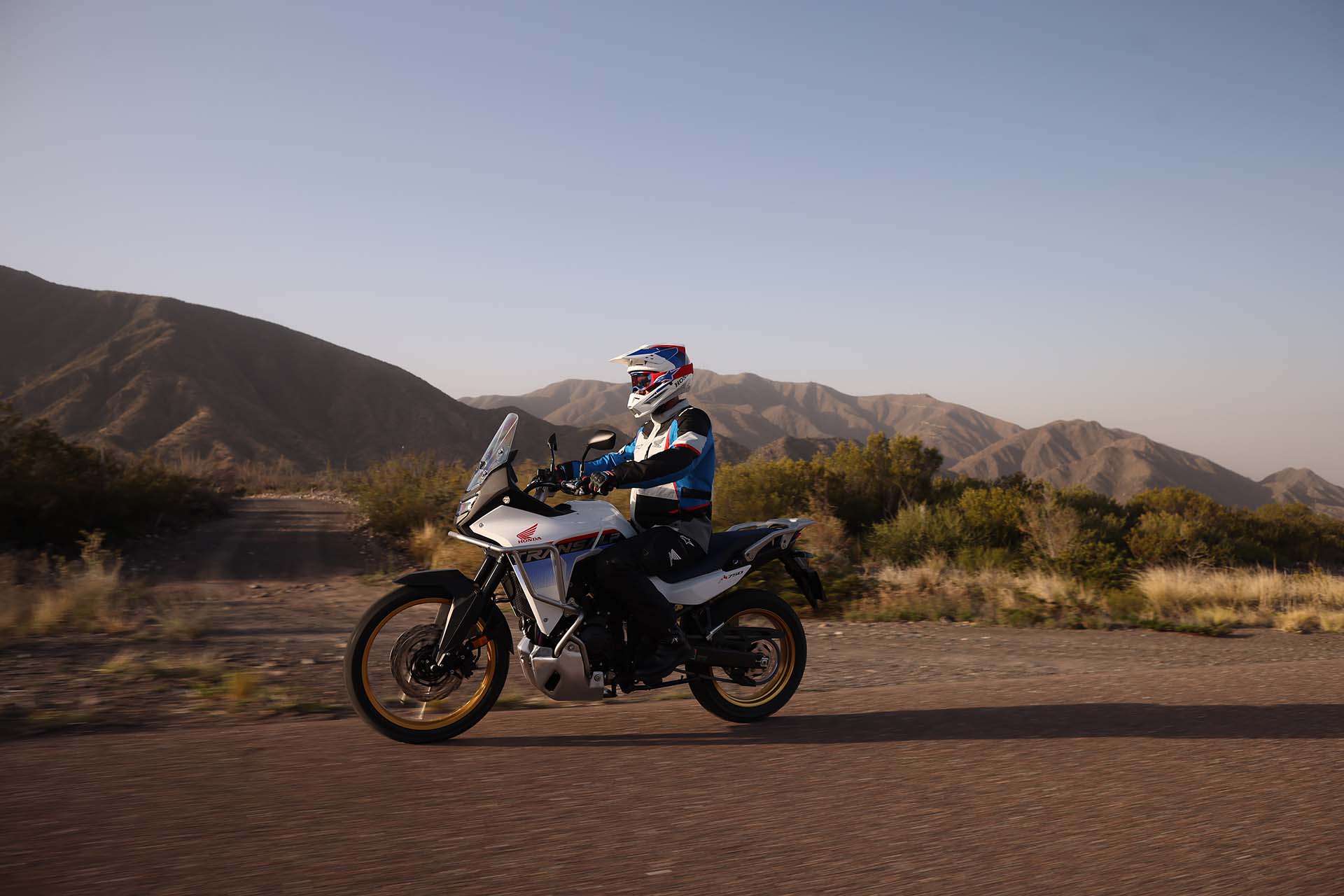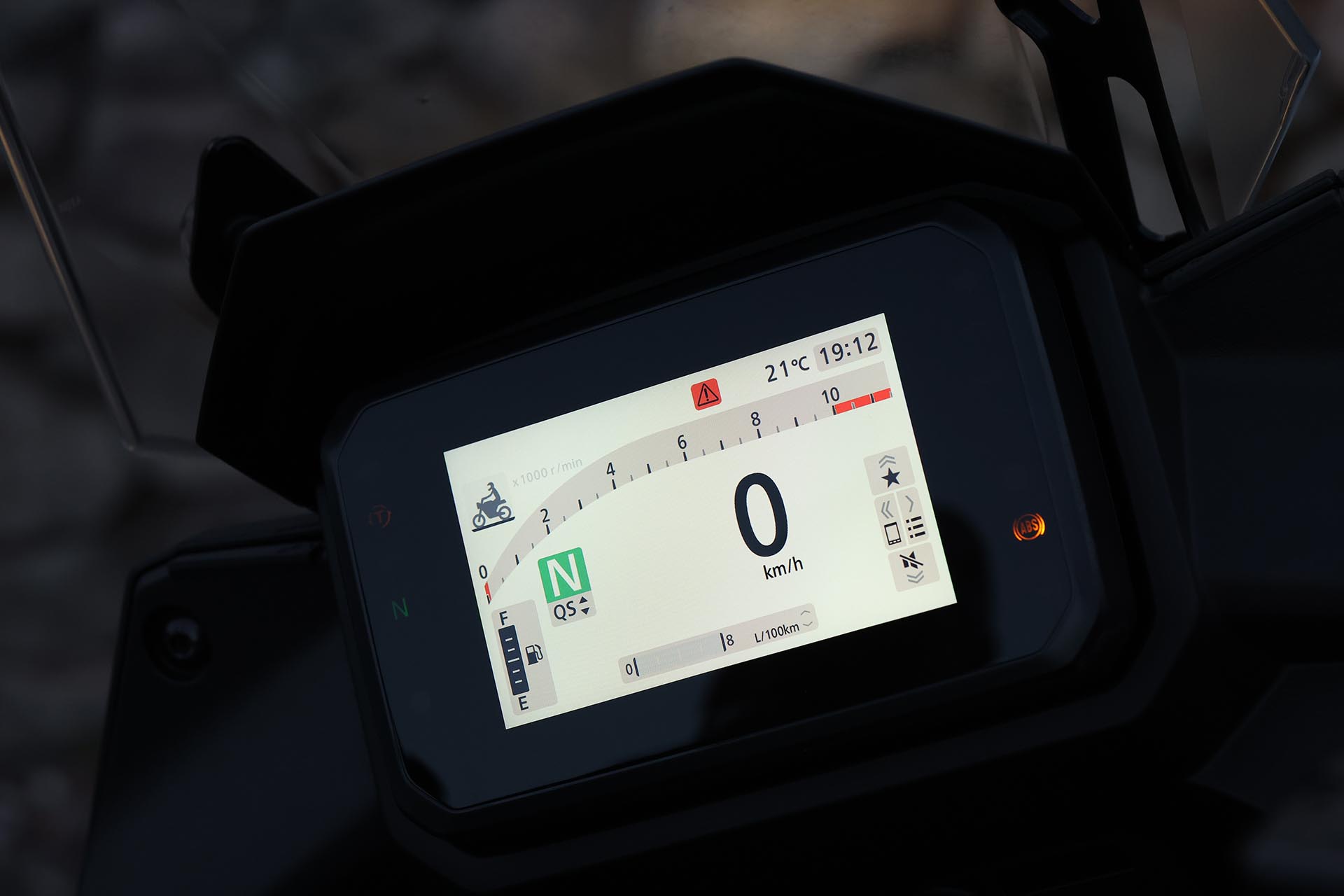 El tanque de 16,9 litros brinda autonomía para largas travesías, mientras que el parabrisas, fabricado en Durabio, refuerza el compromiso de la marca con materiales sostenibles y respetuosos con el ambiente. El tablero TFT de 5 pulgadas ofrece una lectura clara y precisa de la información incluso en condiciones de luz exigentes. Su doble faro proyector LED, inspirado en la Africa Twin, garantiza una excelente visibilidad nocturna. La suspensión delantera está compuesta por una horquilla invertida Showa SFF-CA con 200 mm de recorrido. El sistema de frenos incluye doble disco delantero de 310 mm con pinzas Nissin de dos pistones, que ofrecen gran precisión y respuesta.